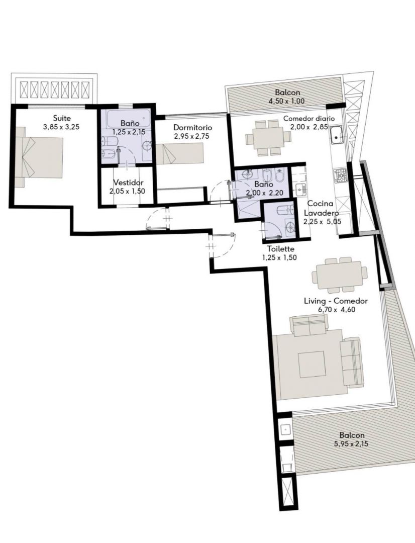 Moderno y luminoso departamento de 3 ambientes con vista abierta a la laguna. Toilette de recepción, cocina integrada con barra, equipada con anafe y horno eléctricos. Living-comedor con ventanales de aluminio anodizado con doble vidrio (DVH), que dan acceso al balcón con parrilla y cerramiento de acero inoxidable. Ambos dormitorios con baño en suite. La suite principal tiene vestidor con terminaciones de alta calidad: porcelanatos en pisos y paredes, grifería y sanitarios de primera línea. El departamento dispone de calefacción por piso radiante con caldera central a gas y termostato individual. El agua caliente es provista por termotanque central. La unidad cuenta con preinstalación para aire acondicionado en living y dormitorio (equipos no incluidos).