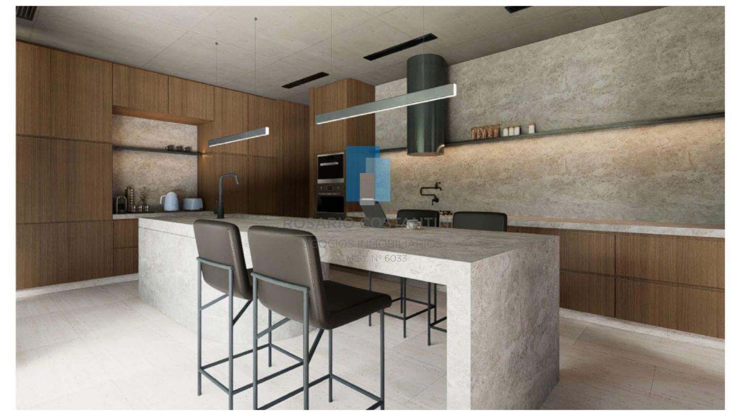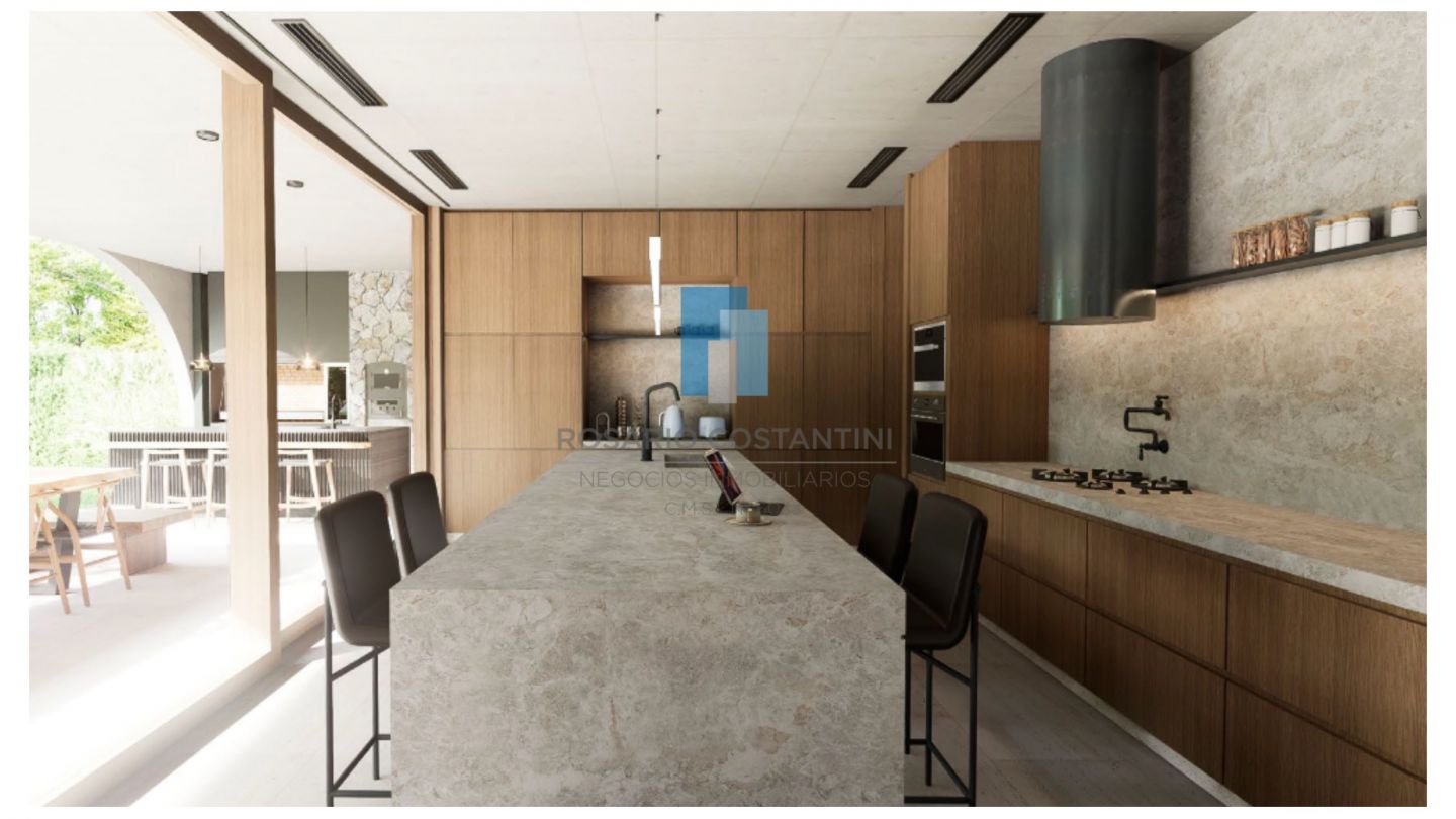 Pisos y escaleras de mármol travertino, muebles de cocina en madera natural combinada con Dekton, herrajes Blum. Horno, microondas empotrado marca SMEG. Heladera panelable marca SMEG. Anafe de 4 artefactos marca Pitt Cooking. Grifería marca Ponthus de diseño.